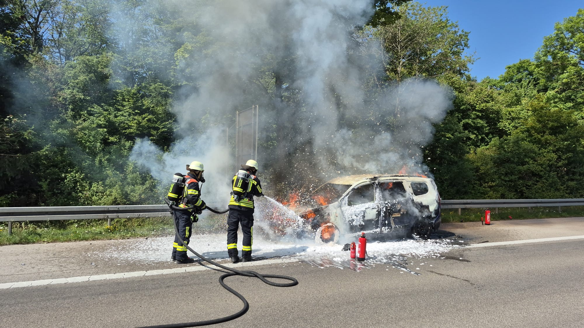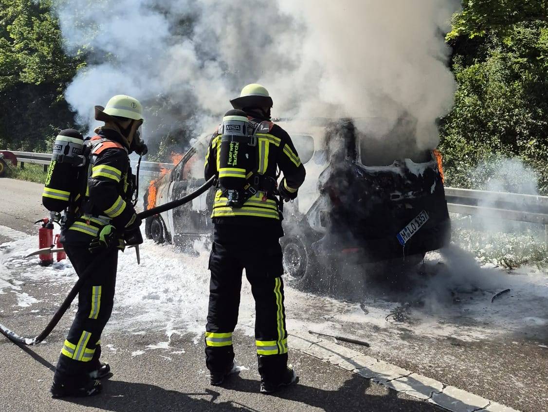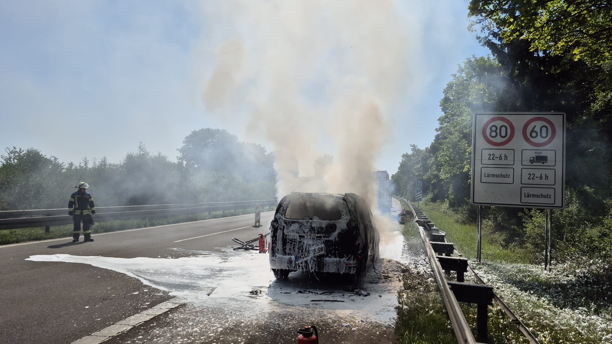 Am 09.08.2025 gegen Mittag kam es auf dem Standstreifen der A995 zu einem Vollbrand eines Pkw mit LPG-Zusatztank. Bei unserem Eintreffen war die Autobahn bereits durch die Polizei gesperrt.
