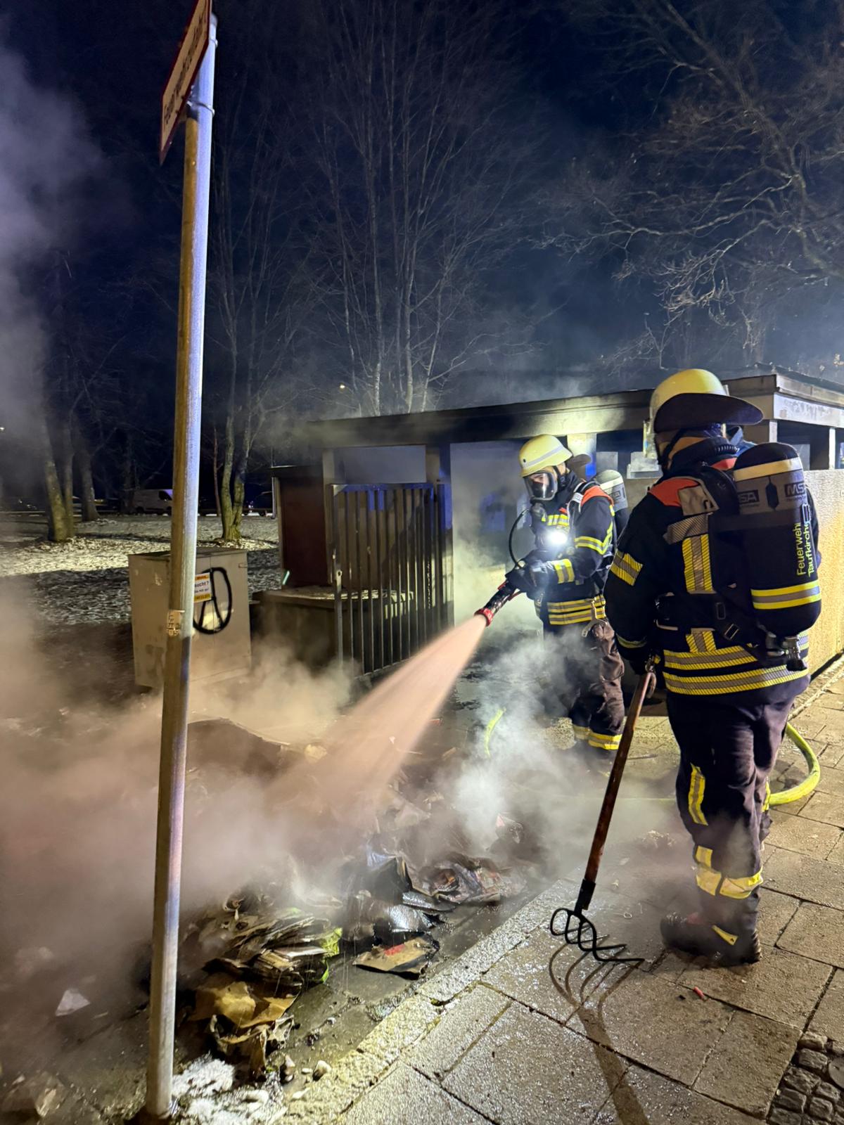 dann ging der erste Melder um 00:08 Uhr: ein brennendes Mülltonnenhäuschen.