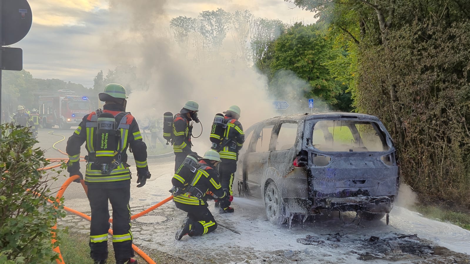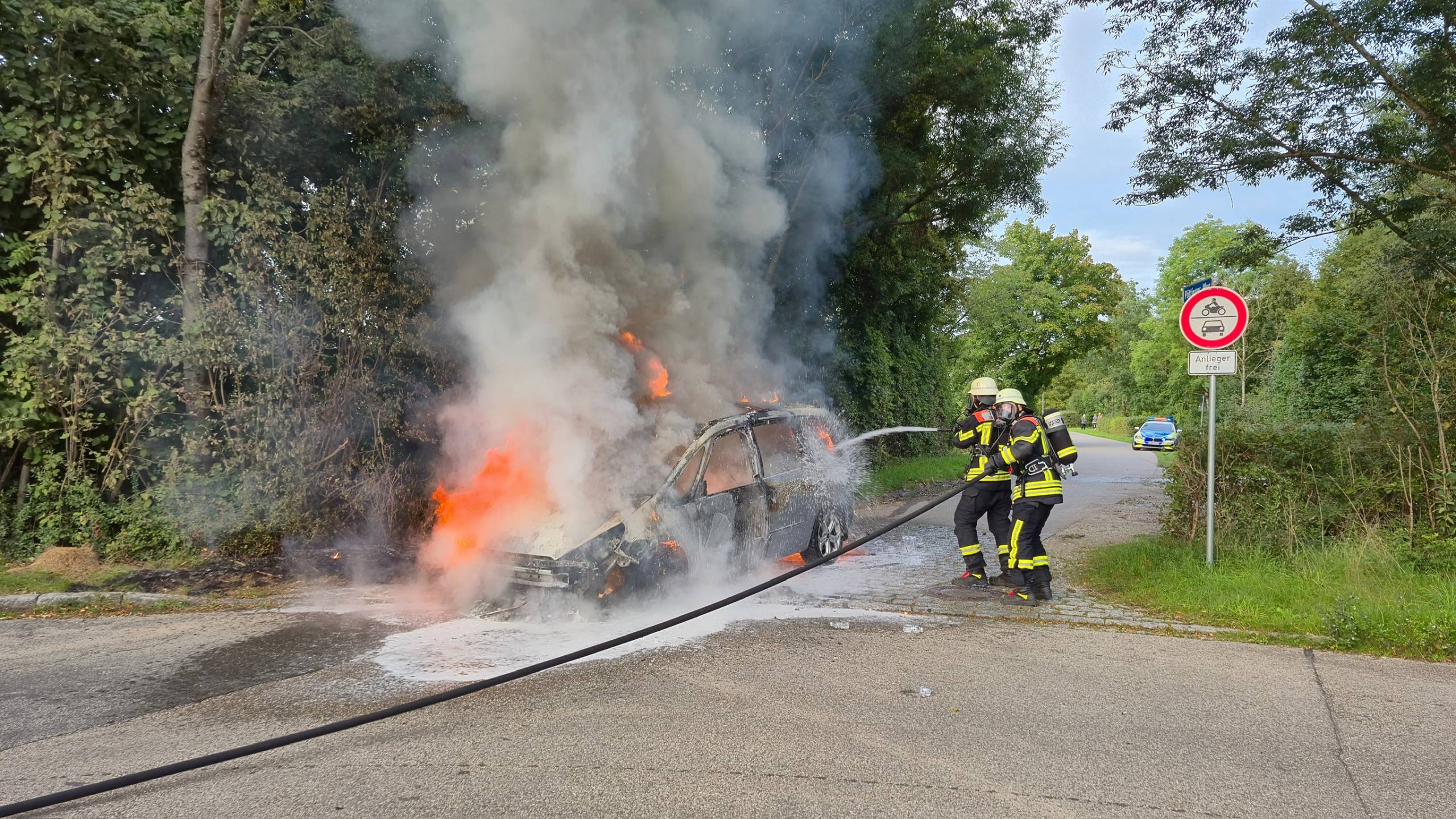 Beim Eintreffen unserer ersten Fahrzeuge stand der PKW bereits in Vollbrand. Sofort wurde mithilfe des Schnellangriffs unseres HLF‘s der PKW unter schwerem Atemschutz gelöscht. Durch das zweite Löschfahrzeug wurde ebenfalls ein Trupp unter Atemschutz zur Brandbekämpfung eingesetzt.