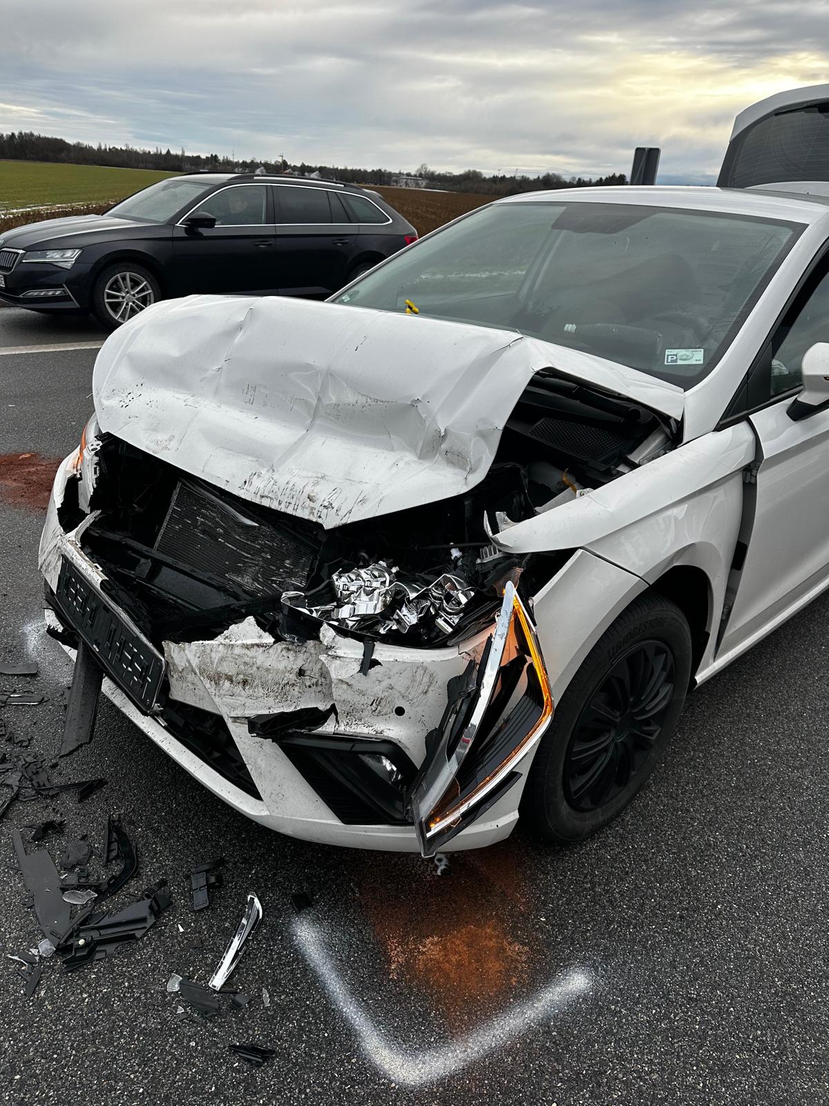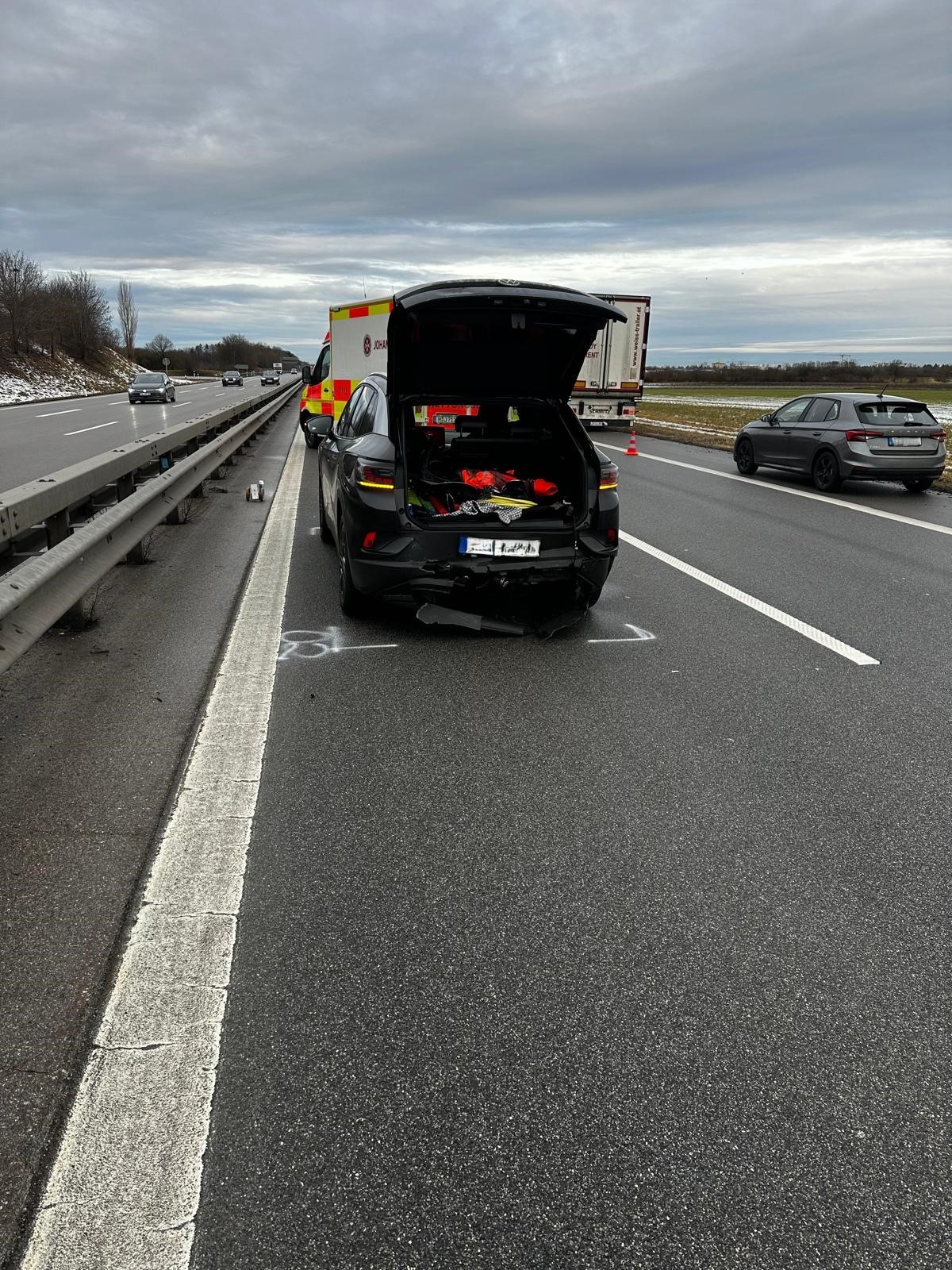 Zwischen den Anschlussstellen Taufkirchen Ost und Unterhaching Ost ist auf der linken Spur ein Fahrzeug auf ein weiteres aufgefahren. Eine Person wurde hierbei leicht verletzt und bei unserem Eintreffen bereits vom Rettungsdienst versorgt.